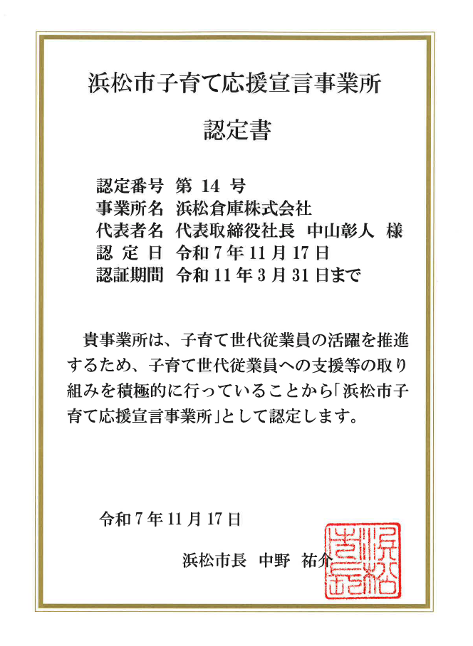 「浜松市子育て応援宣言事業所」に認定されました! - 浜松倉庫株式会社